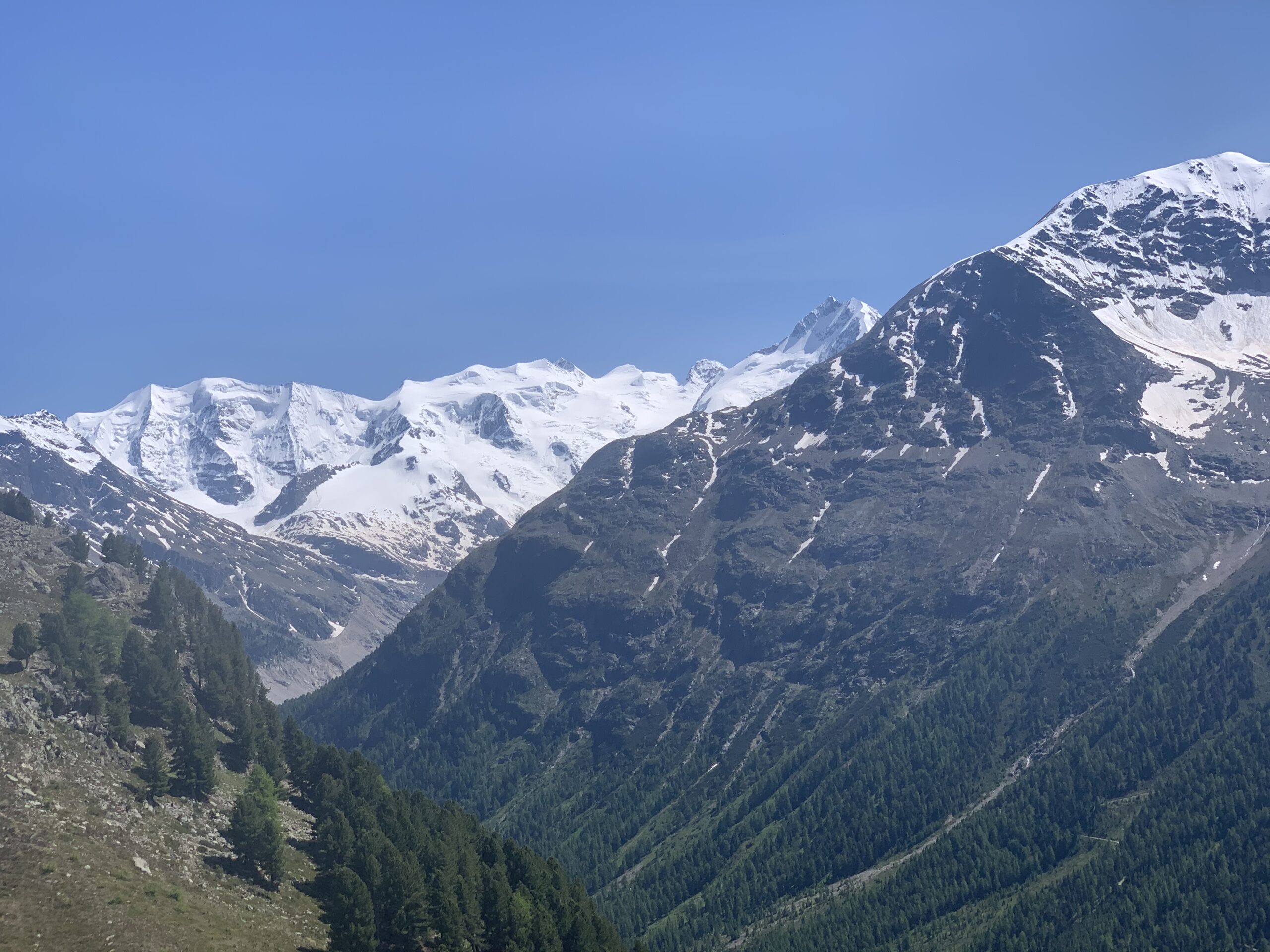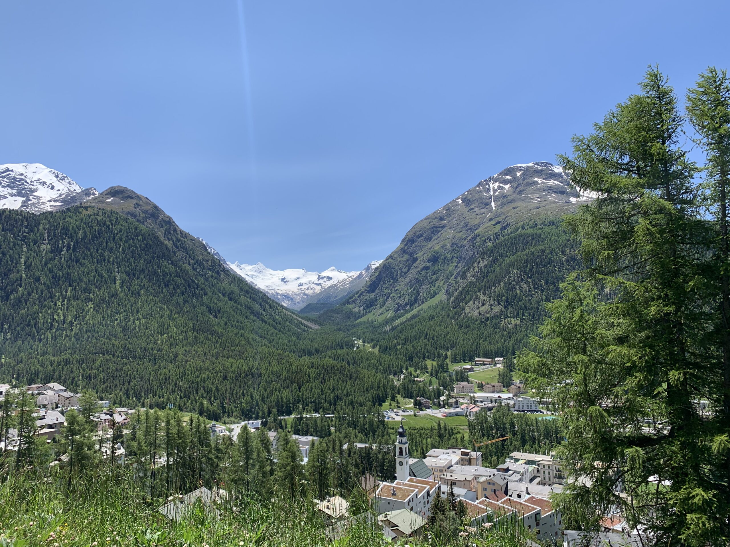 Von Pontresina führt ein breiter Wanderweg sanft ansteigend in den Stazerwald, ein lichtdurchflutetes Lärchen- und Arvengebiet. Das weiche Waldlicht, der moosige Boden und die Stille machen diesen Abschnitt besonders angenehm.